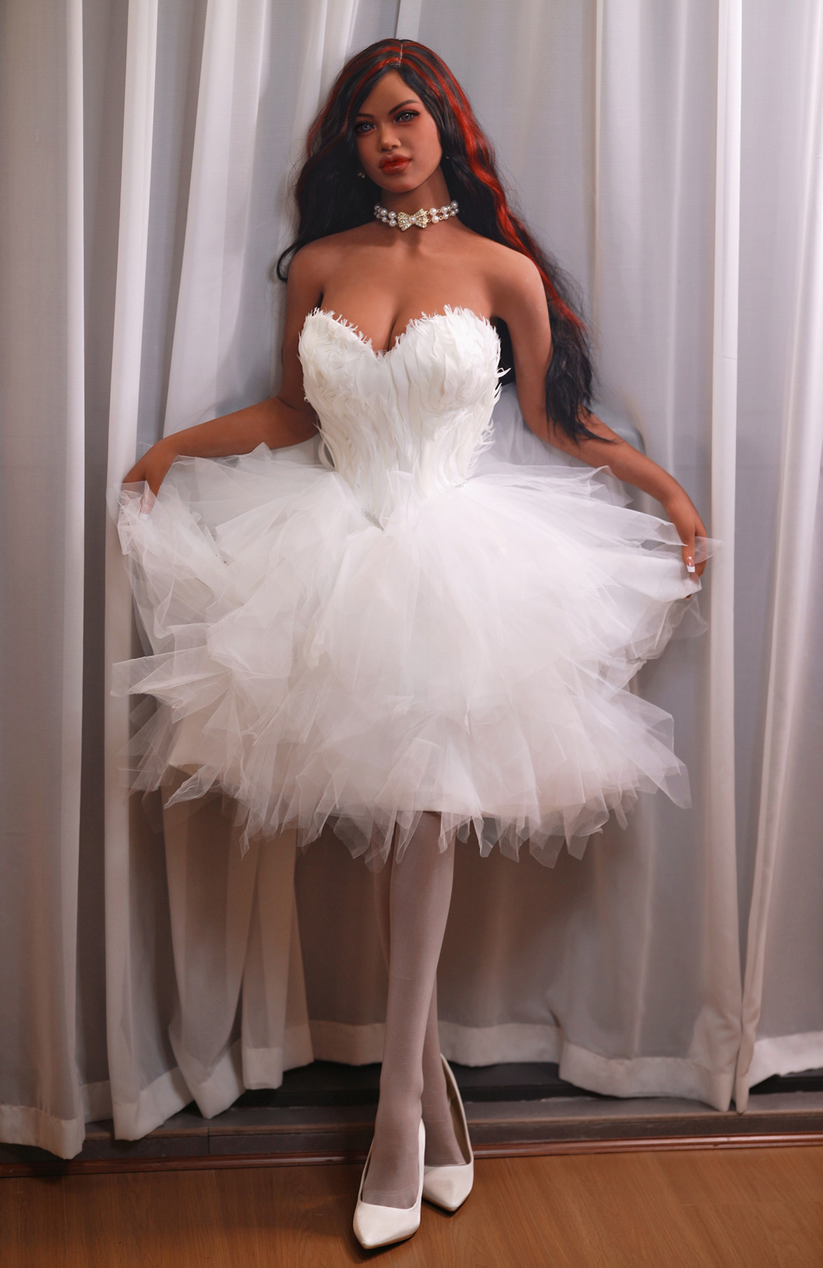 В уютной тишине комнаты стоит реалистичная кукла Aibei с большой грудью, созданная из высококачественного материала TPE. Облаченная в белое свадебное платье, она воплощает мечту о романтической церемонии. Ее белые чулки до колен и туфли подчеркивают стройные ноги, а длинные черные волосы с рыжими бликами ниспадают на спину. Теплый кофейный оттенок кожи и выразительные глаза придают ей неповторимое очарование. Жемчужное ожерелье и белые серьги дополняют образ утонченности. Эта кукла Aibei — не просто фигура, а воплощение романтики, готовая покорить ваше сердце.