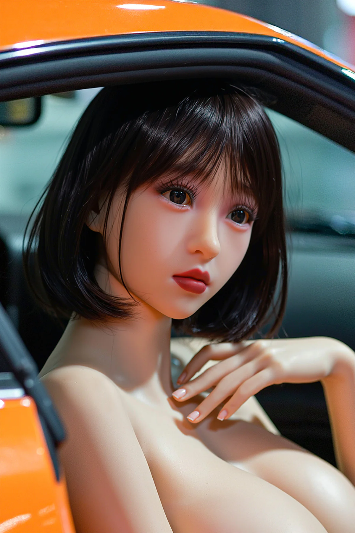 Представьте себе ее, леди в красных солнцезащитных очках, соблазнительно позирующую рядом с оранжевым спортивным автомобилем, одетую в белое белье под оранжевой бейсбольной курткой. Ее реалистичная форма куклы-леди из TPE, с черными короткими волосами и длинными сапогами, отражает сущность современной лисицы. Ее белая нежная кожа резко контрастирует с черными зрачками, добавляя глубину ее загадочному очарованию.