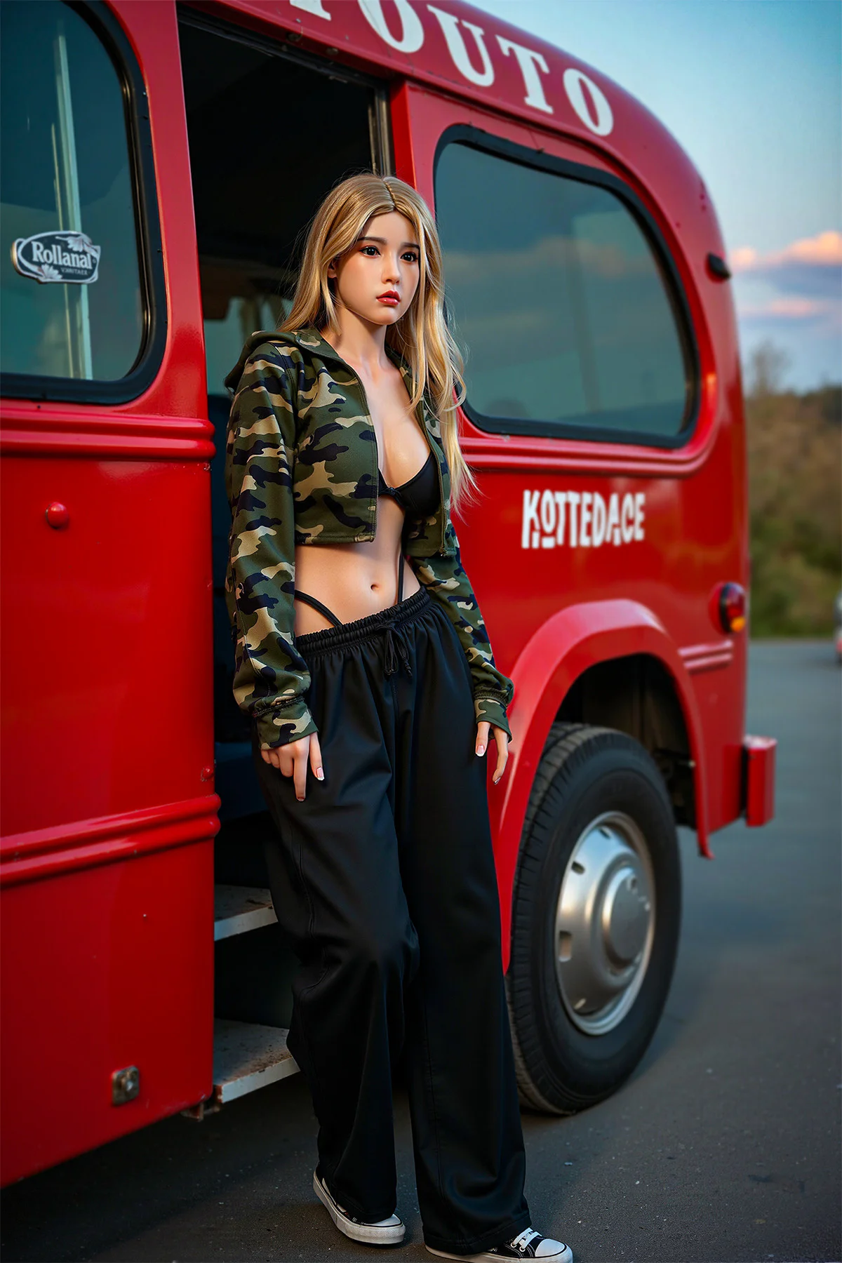 Белые локоны рассыпаются на плечи, а камуфляжный курток с капюшоном обнимает фигуру — она стоит в автобусе, словно ожидает сигнал. Черный бюст подчеркивает большие грудь, а черные спортивные штаны облегают ноги, в белых кедях. Силиконовая кожа 167 см тепла, как дыхание, — реалистичная секс-кукла Aibei дышит ритмом движения. Цепочка на шее блестит, а глаза смотрят сквозь стекло, обещая тайны. Она — молодая женщина-леди в публичном транспорте, сексуальная и нежная, воплощение желания.